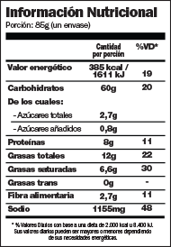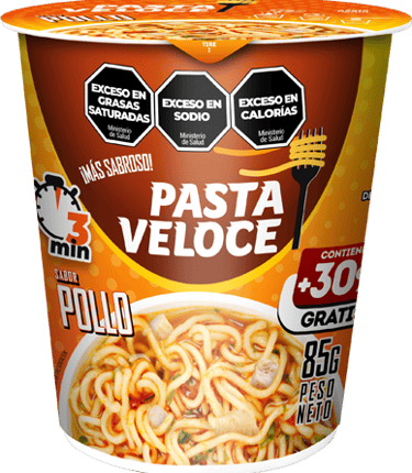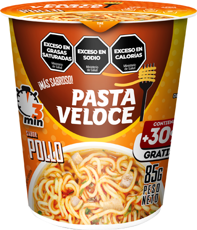 Ingredientes: Harina de trigo enriquecida según ley 25.630 (sulfato ferroso: 30 mg/kg, ácido fólico: 2.2 mg/kg, tiamina (vitamina B1): 6.3 mg/kg, riboflavina (vitamina B2): 1.3 mg/kg y niacina: 13 mg/kg), almidón modificado, aceite de palma refinado, sal, ESP (INS415), ACREG (INS451i, INS339ii), EST (INS452i), EMU (INS422, INS322), COL (INS160ai, INS100i), maltodextrina. Aderezo: saborizante de pollo, zanahoria, chauchas liofilizadas, maíz liofilizado, maltodextrina, azúcar, sal, EXA (INS621), aceite de pollo. CONTIENE DERIVADOS DE TRIGO Y SOJA.